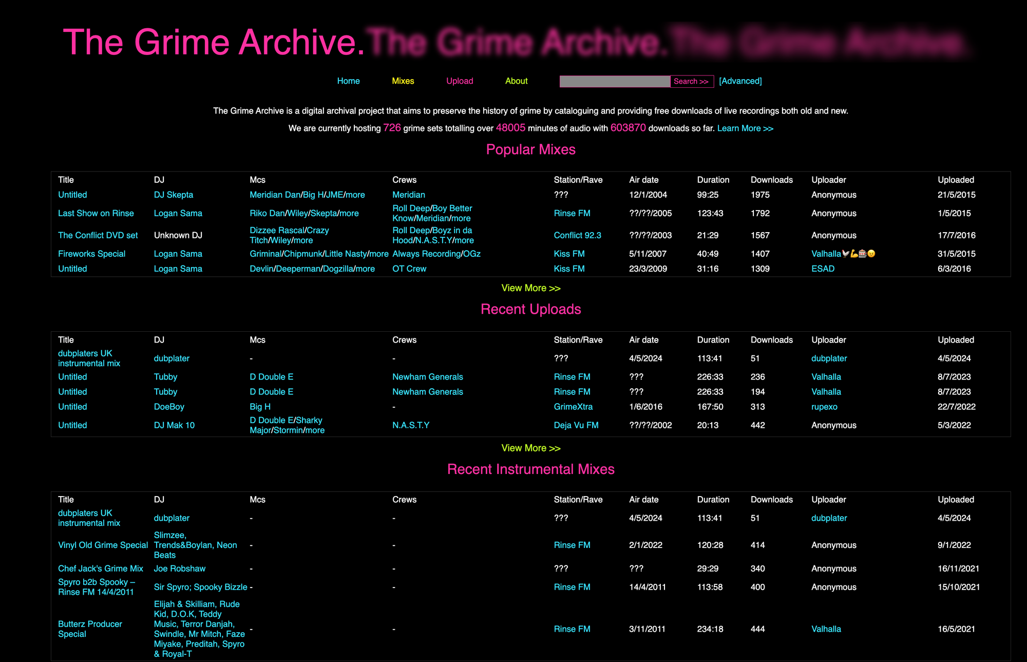 That was around 2015, I believe. I noticed that, because of copyright issues and pirate radio in general, the whole radio history of grime was not archived well anywhere besides like YouTube at the time. A lot of people were sharing on MediaFire and SendSpace and all those other shifty upload sites. I was like, this is this is not good for the long term. There had already been a couple similar projects. There was Barefiles in the mid 2000s for dubstep sets, and Slakk, a grime producer, was archiving sets for a while.