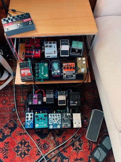 So I asked Patrick to label the pedals on his board with a few words maximum, to describe what each of them do for the A Beacon School Sound. He graciously obliged! Below, the annotated pedal board...