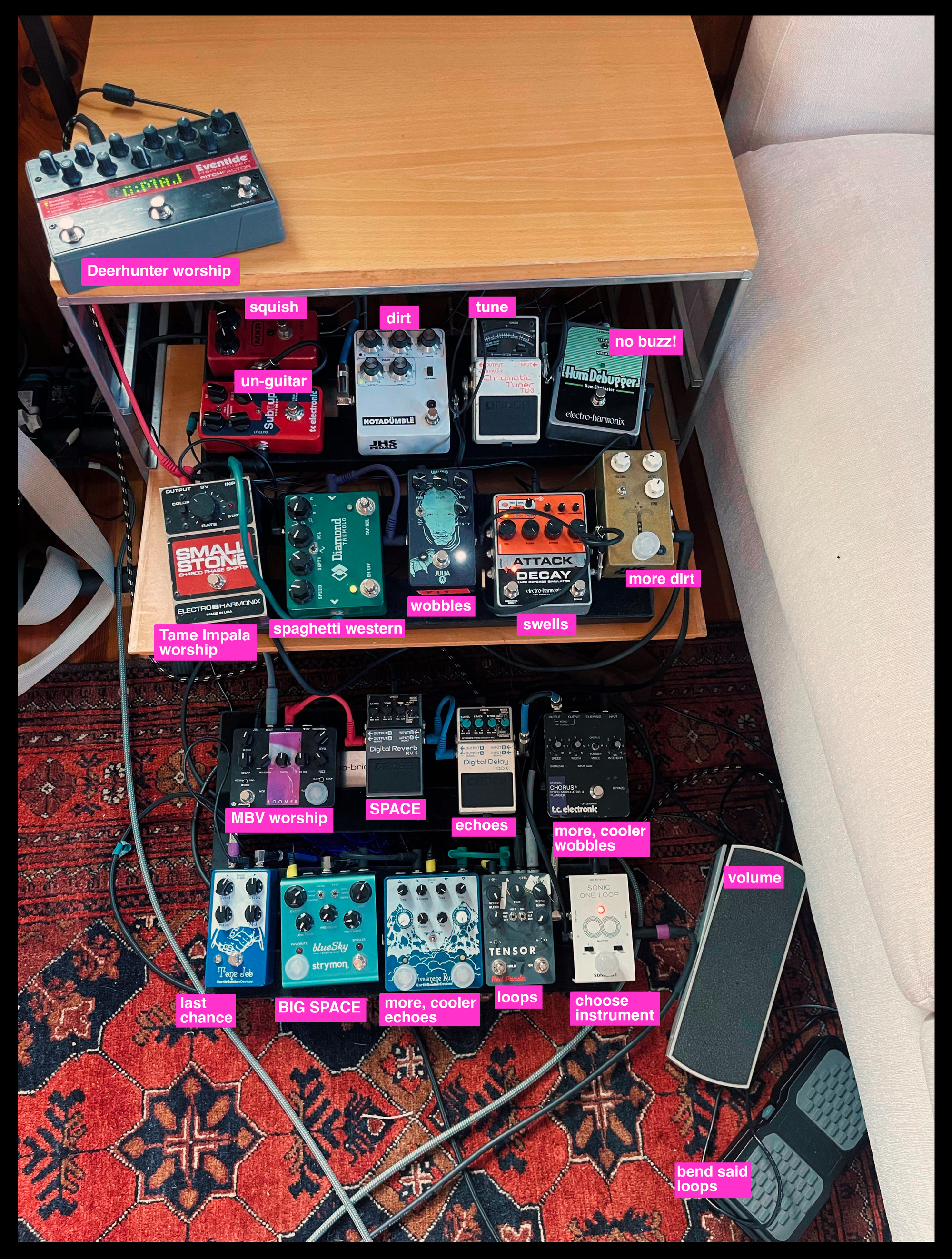 Recently Patrick posted on Instagram that he was re-doing his guitar pedal board, and I pounced on the opportunity to do a feature that I have wanted to do for a while on I Enjoy Music, which is an ANNOTATED PEDAL BOARD. I learned to play guitar in middle school but never got advanced enough to start messing with, like, Tones and such, so the pedal board has always been a source of fascination to me. I feel like pedal boards exist...at the intersection...of art and technology? And they have a Things Organized Neatly quality that speaks to my heart, as well as the rough rectangular dimensions of a pack of cigarettes (the most wonderfully sized object of all time).