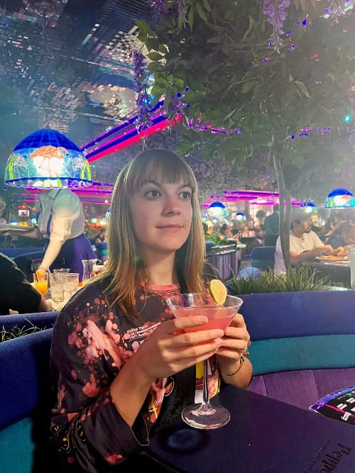 We left a little early, I will admit. Our friends Jake and Betsy were meeting us for the weekend and we realized our experiential cups were as full as they could be. I have a personal theory of socialization called Leave On A High Note (LOAHN)—don't wait around for things to start sucking if you're ready to dip. A line of Sphere employees waved us out, wishing us a good night. We took another taxi to the Peppermill, my favorite restaurant in Las Vegas. It's full of lush greenery and slices of neon purple and pink lighting, and the salads they serve are unparalleled. I ordered a Cosmo. We let ourselves chomp at last. The Cobb was delicious.