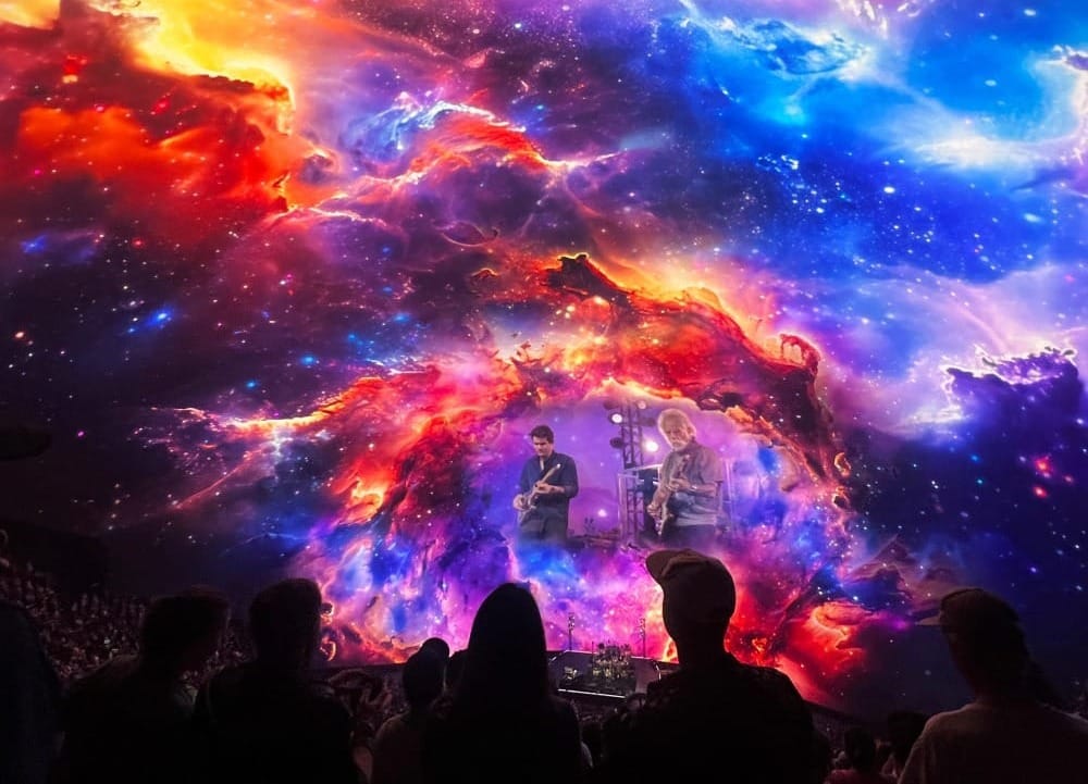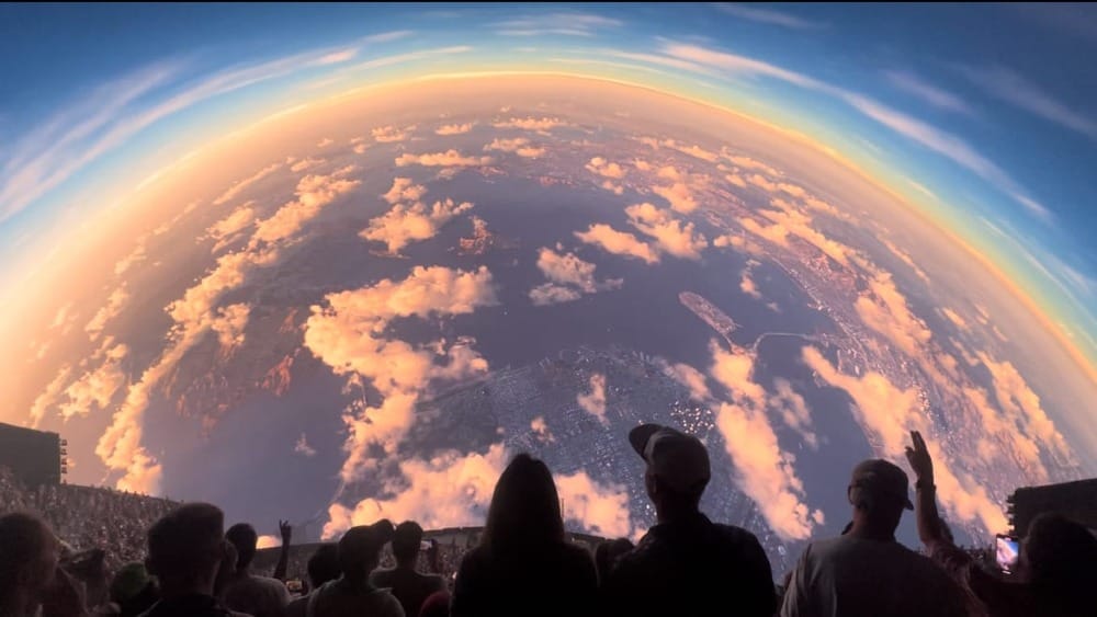 The show was just beginning when we sat down. The band were ants on a little anthill, but the Sphere screen was vast and we could take in the entire expanse of it from our vantage point. You could see the industrial seams of the structure, latticed and backlit, and the band was projected simply above the backdrop. Then the ride began.