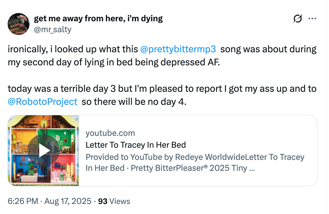 This song alludes to Tracey Emin's artwork My Bed, a recreation of the artist's bedroom after she spent four days in a depressive spiral, doing what the kids today call "bed rotting." Apparently that piece got a lot of scorn back in the late 1900s when it was exhibited, but of course the relevance today is undeniable. You could argue that in 2025, it's never been easier to stay in bed, and so the act of getting out of bed and doing something, anything, is something that needs to be cultivated and celebrated. I can't remember who gave this advice—maybe the legendary beauty writer Cat Marnell?—but the most important thing you can do in the morning is make your bed, because that means it makes it so much harder to get back into. That's a hot tip for the bedheads. Anyway, the chorus to "Letter to Tracey In Her Bed" is incredible, I really love Mel Bleker's voice.