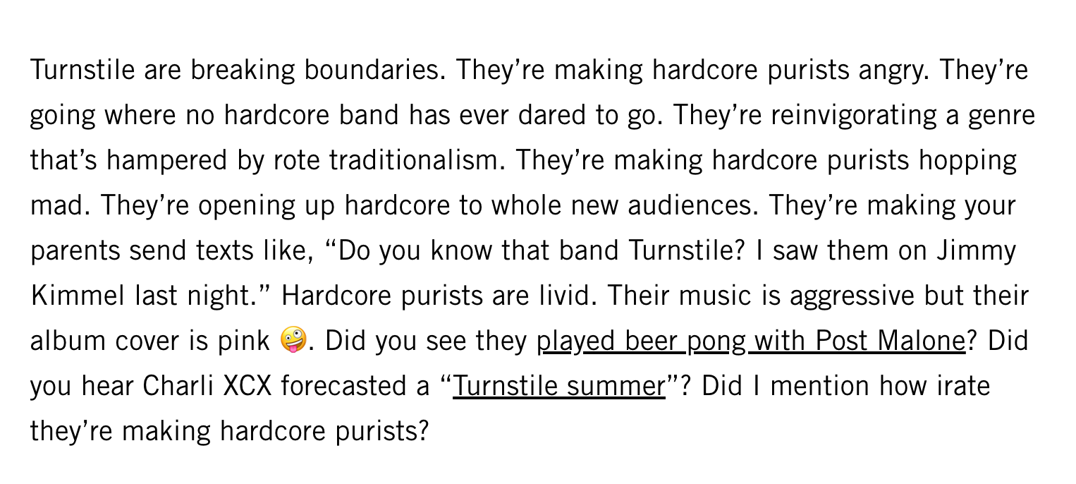 What could be an easy dunk / dismissal of Turnstile's storied Fresh New Twist On Hardcore is instead a thoughtful and thorough digestion of the album, backed up by deep knowledge of the current hardcore scene. If you read Eli's great newsletter Chasing Sundays, you know he is out there in the pit getting his shit rocked for the story. He is Outside, he knows what's up. Expertise + entertainment, exactly what we want out of music criticism, right folks??