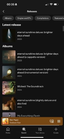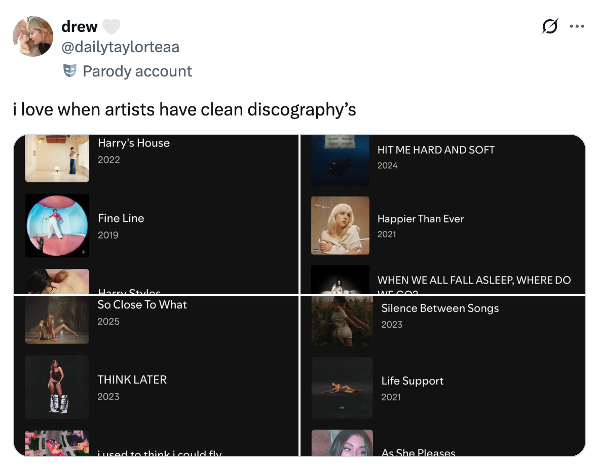 ...and it took me a second of scrolling the replies to understand what a "clean discography" is, but I figured out that they're talking about when an artist's streaming profile doesn't have multiple versions of albums (deluxe, instrumental, compilation, soundtrack, etc.) visible, just their main releases in chronological order. Someone else shared an example of an artist who does NOT have a clean discography: