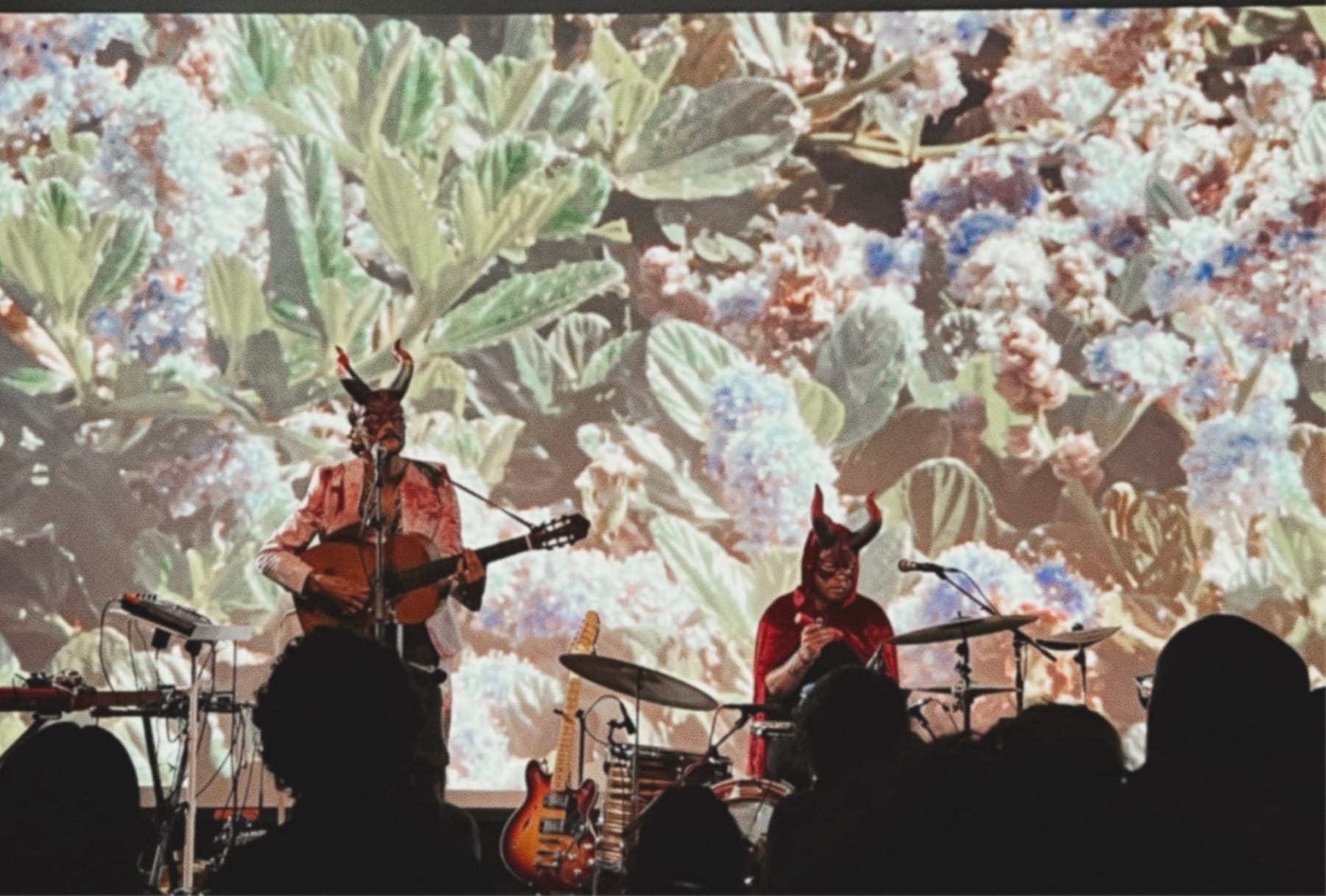 When I arrived, opener Gabriel da Rosa was playing charming Brazilian music and wearing a blood-spattered white blazer, both he and his drummer's noggins adorned with Baphomet-style horns. The horror costume aesthetic was offset somewhat by the pleasant nature vistas projected on the back wall. At one point da Rosa switched from acoustic to electric guitar and ripped a deeply gnarly solo over his bossa nova track—one of those fuzzy, dirty, indulgent expressions of sound that represent sheer delight at the capabilities of the six-stringed creature known as a Guitar.